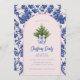 Cette invitation de Noël a un design primitif et millénaire avec un sapin de Noël dans une crête de pot en Chinoiserie bleue et blanche avec une bordure en arcade bleue et rose vif autour du bord. L'avant et l'arrière ont un motif de damas de coordination.