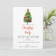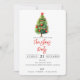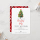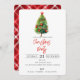 Cette carte d'invitation comprend un pin d'aquarelle, un script rouge "fête de Noël", et un arrière - plan tartan rouge de Noël. personnalisez avec votre nom de famille et les détails de votre fête.
