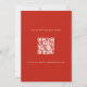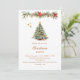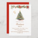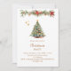 Une invitation hivernale pour une fête de Noël. Un arrière - plan blanc à l'avant décoré d'un pin dessiné à la main couleur de l'eau avec des ornements rouges et dorés. Quelques étoiles et une guirlande décorée de Noël avec des cônes et des fleurs de Poinsettia rouges. Personnalisez et ajoutez les détails de votre fête. Texte doré. Retour : arrière - plan rouge. Ajoutez l'URL de votre site Web au code QR pour les détails RSVP et/ou du parti.