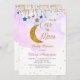 Rainbow Over the Moon Baby shower Invitation pour une fille avec une lune, des étoiles et une belle parties scintillant faux or.