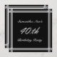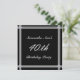 Cette magnifique invitation féminine à la fête du 40e anniversaire a un arrière - plan noir avec des groupes de tuyauteries dans les tons gris argenté métallique. Des emblèmes d'effet de pierre à gemmes de diamant éclatants ornent les coins et le texte : 40 ème en argent décoratif orne le centre. D'autres tailles et couleurs sont disponibles en magasin.