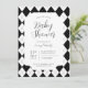 Invitation classique et intemporelle pour baby shower en noir et blanc à motif argyle. Styles de police et disposition personnalisables, avec un fond à motif simple et des formes de diamant géométriques épurées. Parfait pour les invitations de baby shower unisexes, les invitations de baby shower pour garçon, et les invitations de baby shower preppy.