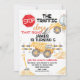 Invitation d'anniversaire pour garçon sur le thème de la construction avec un camion à benne, un escalator, de la terre et un panneau d'arrêt rouge. Peut être utilisé pour tout âge et idéal pour une fête d'anniversaire de garçon sur le thème de la construction.
