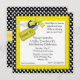 Invitation élégante de fête d'anniversaire du bonbon 16 faite en pois noir et blanc d'amusement, avec un cadre jaune lumineux autour d'un secteur blanc des textes. Les graphiques mignons d'une clé de voiture, sur un porte-clés jaune et un arc assez jaune joints, décore le coin gauche supérieur de l'invitation. Le texte dans le noir est prêt à personnaliser pour le jour spécial de votre fille.