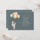 This first birthday thank you card features a hand-painted astronaut holding balloons with scattered stars on a muted blue background. The phrase “One Big Thank You” ties into a countdown-inspired first birthday theme. The artwork colors are not editable, but all text can be personalized to match your celebration.