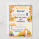 ATTENTION ! Chariots de construction Invitation de fête d'anniversaire. Célébrez la journée spéciale de votre petit avec cet invitation d'anniversaire de camions de construction! Une invitation à la fête d'anniversaire amusante pour une fête d'anniversaire sur le thème de la construction! Ce design à deux côtés présente des véhicules de construction : un tracteur, un creuseur, une grue et un camion de ciment en jaune, blanc, noir, bleu et gris.