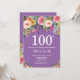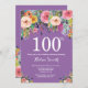 Invitation florale violette 100e anniversaire pour les femmes. Fleur florale aquarelle. Arrière - plan violet Lilac Lavender Violet. Rose, Jaune, Orange, Fleur Violet. Anniversaire adulte. 13e 15e 16e 18e 20e 21e 30e 40e 50e 60e 70e 80e 90e 100e, n'importe quel âge.
