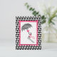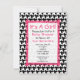 Invitation baby shower avec un arrière - plan en bois noir et blanc et une section centrale en rose vif à l'avant et à l'arrière. Caractéristiques avant illustration d'un parapluie d'impression en pied de jambe avec un arc rose sur la poignée. Le texte "Baby shower" est suspendu à la poignée. Personnalisez le côté opposé avec les détails de votre événement.