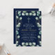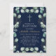 Invitation au baptême d'Eucalyptus. Fleur d'eucalyptus d'aquarelle aux feuilles dorés et arrière - plan bleu foncé. Invitation vos proches à assister et célébrer un baptême sacré avec notre invitation à la fleur d'eucalyptus magnifiquement conçue.