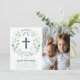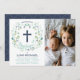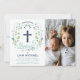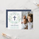 Ce baptême élégant et élégant, invitation à baptiser, présente une couronne florale illustrée avec le mot "baptême" encerclant une croix. Le côté droit de la carte comprend une zone photo personnalisable. La couleur du texte, la police et le message peuvent être changés à votre goût. L'arrière de l'invitation est muni d'un arrière - plan de marine (qui peut être échangé à n'importe quelle couleur de votre choix) avec un motif de quatrefoil blanc.
