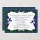 Élégante invitation à dîner de répétition de mariage en plastique tartan sur mesure. Une zone de texte blanc décoratif surplombe le arrière - plan de plaid de clan bleu et vert Scott. De jolis petits arcs bleus décorent les deux côtés de la zone de texte. Personnalisez le texte en fonction des besoins de votre parti.