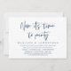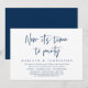 Carte d'invitation de mariage thème écriture moderne bleu marine (C'est maintenant l'heure de faire la fête ). Elle est parfaite pour votre dîner de mariage intime et décontracté au bord du lac, pour danser et faire la fête.