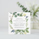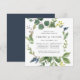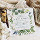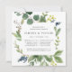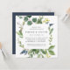 Notre invitation au dîner de répétition dans un bosquet d'eucalyptus, dans un format carré unique, encadre les détails de votre répétition de cérémonie et de dîner avec un feuillage d'eucalyptus aquarellé, des feuilles vertes et de minuscules bourgeons bleu marine. Un choix moderne mais organique pour les dîners de répétition d'automne et d'hiver, avec un feuillage botanique vert frais et une lettre élégante.