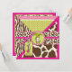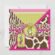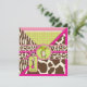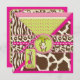 Impressions de Safari, girafe, zèbre, guépard et motif à pois de polka, avec singe accroché sur une vigne et des étiquettes d'apparence 3D, arcs, trimes une carte d'invitation de premier anniversaire.