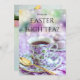 Invitation à une fête d'anniversaire de style britannique ou à un brunch de Pâques ou à un thé de l'après-midi avec un thé coloré sur le devant et des fleurs élégantes de tulipes printanières au dos