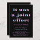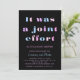 Une invitation parfaite pour le couple qui s'attend ! Ce invitation présente "C'était un effort conjoint" en caractères gras multicolores sur un arrière - plan noir avec vos informations de douche en dessous et sur le côté arrière est noir solide, mais peut être customisé pour répondre à vos besoins.
