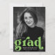 Invitations audacieuses à la fête de remise des diplômes avec la photo verticale du diplômé avec "grad" en gras vert citron. Personnalisez les invitations de la fête de remise de diplômes en y ajoutant le nom du diplômé, l'année de fin d'études et l'école. Les invitations de la fête de graduation vert citron s'inversent pour afficher les détails de votre fête.