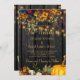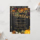 Belle orange rouille et bordeaux foncé automne fleurs et bordures citrouilles avec cordes de lumières scintillantes dorées sur un arrière - plan de grange brun foncé pour une élégante invitation de mariage avec une écriture manuscrite manuscrite script de typographie or. ++++++++++ Facile à personnaliser avec vos détails ! Convient pour automne traditionnel automne rustique | pays | ferme | mariages de jardins extérieurs.
