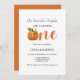 Une carte d'invitation à l'anniversaire élégante et tendance avec un citrouille orange brûlé aux feuilles d'automne. Selon le libellé, "nos petits citrouilles en font un."
