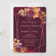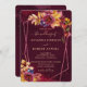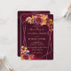 Feuilles d'automne dorées, fleurs de marsala et bleuets riches décorent un cadre géométrique or rose. Le riche arrière - plan rouge bordeaux lui donne une ambiance cosy d'automne. Le confetti d'or ajoute une touche glam ! Vos invités aimeront ce faire-part de mariage d'automne unique.