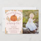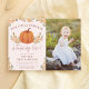 Une mignonne petite fille citrouille 1er anniversaire photo invitation modèle. Cette conception d'automne comporte une illustration citrouille, des fleurs colorées de pêche et une police calligraphique sur un arrière - plan rose clair.