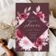 Célébrez un mariage d'automne romantique avec cette élégante invitation florale qui comprend un cadre diamant géométrique doré, des dahlias bordeaux aquarelles, des pivoines rousses et un feuillage d'automne rustique. Idéal pour les mariages campagnards extérieurs, les jardins boho ou les douces touches vintages.