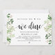 Carte d'invitation thématique moderne rustique avec verdure et feuilles d'été, écriture noire (avec titre de carte : Avant de nous marier, nous dînons !). Elle est parfaite pour votre dîner de répétition de mariage, avant votre plus beau jour. Ajoutez vos détails dans la même police / lettrage noir.