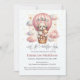 Captivant "Let the Adventure Begin" invitation à baby shower thématique avec un adorable chiot tenant un ours en peluche dans une montgolfière rose mauve. L'arrière - plan est des aquarelles avec des nuages blancs, roses et bleus avec des étoiles dorées environnantes. Motif étoile blanche sur rose mauve sur le dos de l'invitation. Modèles fournis.