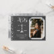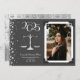 Célébrez le nouveau doctorat de juris de l'école de droit avec cette balance d'argent et gris avocat faire-part de graduation! Elégant avec une bordure photo vintage et des accents de confettis dorés ! Parfait pour tous ceux qui terminent leurs études de droit !