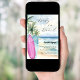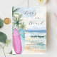 Une élégante invitation au Baby shower, Plage de sable couleur eau, vagues de l'océan et palmiers en arrière - plan, planche de surf bleue et rose sur la plage. Pour un genre révéler ou attendre des jumeaux.