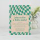 Célébrez dans le style avec cette invitation baby shower d'inspiration rétro avec un motif branché à damiers ondulé en vert. Avec un texte personnalisable et une palette de couleurs vibrantes, ce design moderne et ludique donne le ton parfait pour une célébration amusante et mémorable. Personnalisez les détails pour en faire le vôtre !
