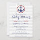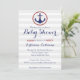 Ces adorables invitations à l'ancre nautique sont parfaites pour les baby showers filles et garçons ! Elles disposent d'un arrière - plan rayé gris clair. Au-dessus de l'arrière - plan se trouve un cercle de corde rouge qui contient une ancre bleu marine.