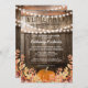 Invitations rustiques de douches pour bébé automne avec un arrière - plan de tonneau de chêne de campagne, des lampes à cordes, des feuilles d'automne, un citrouille de récolte, et un modèle baby shower facile à personnaliser.