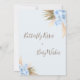 Blue Boho Floral Butterfly Kisses Baby shower Invitation Baisers papillon moderne et voeux de bébé invitation baby shower avec deux arrangements floraux sèches de style bohème avec pampas herbe, roses bleus et feuilles de palme. Le design comprend également trois papillons parties scintillant en or rose et une police de caractères mono-ligne moderne.