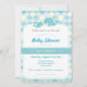 Invitation Baby shower mignonne dans un jeu de couleurs turquoise et turquoise, avec une illustration de baleine et arrière - plan motif géométrique.