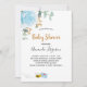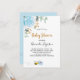 Pour un Baby shower, célébrer un bébé garçon. Un arrière - plan blanc chic. Décorée d'un rose bleu clair, de fleurs, de végétation fleurie et verte d'eucalyptus, de feuilles, d'un écorce dorée et d'une jolie abeille souriante portant une enveloppe. Personnalisez et ajoutez un nom et des détails du parti. Lettres noires et dorées. Le texte : Baby shower et le nom de la mère à abeilles sont écrits avec un script de style manuscrit moderne. Dos : couleur arrière - plan bleu clair et l'abeille souriante.