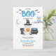 Célébrez Halloween en utilisant notre Baby shower Blue A Little Boo Invitation! Ce design enchanteur présente un fantôme mignon portant un casquette sorcier et tenant un citrouille, un chat ludique, une adorable chouette bleue et un chaudron bleu bouillonnant. Les chauves-souris flottent à travers le ciel, avec une lune brillante et des étoiles étincelantes qui ajoutent à l'atmosphère magique. BBS455