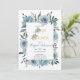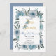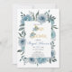 Baby shower de fleurs bleu azur pour invitation garçons. Ce joli design floral présente un cadre floral composé de fleurs bleues poussiéreuses et de feuilles succulents et de votre texte. Les mots "Baby shower" sont en or dans une police décorative avec des bouquets floraux tandis que le nom de la mère à être est en typographie de script.
