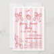 Baby shower de fraise rouge à main Drawn Invitation baby shower à thème de baies douce et décalé comprenant une seule fraise et une branche de fraise, deux arcs et un arrière - plan motif rayé blanc et rose vif. Au fond de l'invitation se trouvent également le motif rayé et des illustrations dessinées à la main.