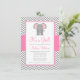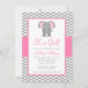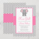 Une invitation baby shower à thème moderne pour les jeunes filles. Avec une jolie illustration d'éléphants et un motif chevron dans les tons rose et gris. Personnalisez facilement votre fête !