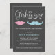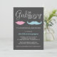 Un sexe mignon et capricieux révèle aux couples une invitation baby shower avec une moustache et des lèvres contre un arrière - plan sombre chic. Egalement disponible avec un arrière - plan blanc :
