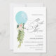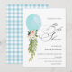 Bleu Balloon Calligraphie Script Baby shower Cartes d'invitation. Le chèque bleu en vichy arrière - plan au dos de la carte peut être redimensionné. Le bouquet de fleurs peut être enlevé.