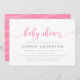 Baby shower élégant Invitation avec les mots "Baby shower" dans un script de relaxation cursive en rose contre un arrière - plan blanc. La carte est recouverte d'un côté rose avec des lignes qui se chevauchent. Personnalisez-le en remplaçant le texte de l'espace réservé. Pour plus d'options comme changer la police et sa taille/couleur ou l'espacement entre les lettres cliquez sur le bouton "Personnaliser". *Veuillez noter que le filigrane Zazzle qui apparaît dans l'aperçu du zoom n'apparaîtra PAS sur le produit imprimé final. © Bois de rose et agrumes