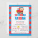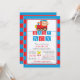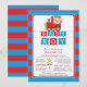 Baby shower de singe safari dans la jungle moderne avec un petit singe mignon à cheval sur un choo choo train lumineux et coloré sur un arrière - plan à bande rouge & bleu avec un accent de passage de chemin de fer et des bannières pendentifs. Retournez l'invitation baby shower de nos garçons pour voir un retour correspondant pour une touche spéciale supplémentaire. Parfait pour un thème singe, le thème jungle ou le thème safari zoo petite douche bébé garçon.