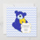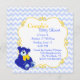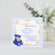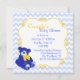 Un joli carré a façonné l'invitation baby shower d'un couple faite dans un arrière - plan motif zigzag bleu clair et blanc au chevron. Les graphiques d'une zone de texte encadrée jaune, ont un adorable ours en peluche bleu, en bas à gauche et à l'arrière. Personnalisez le texte bleu et jaune, à l'avant et au dos, selon vos besoins. Très design et moderne avec un look sucré et fantaisiste.