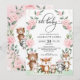 Cette très jolie invitation au baby shower sur le thème des bois présente d'adorables animaux de la forêt et une douce couronne de fleurs roses. Utilisez les outils de conception pour modifier le texte, modifier la couleur et le style de police pour créer un modèle unique d'invitation aimable.