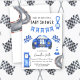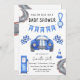 Carte d'invitation baby shower à thème automobile course avec aquarelle illustrant une voiture bleue et piste de course, station essence, drapeau de course. "Course pour un baby shower."