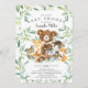 Un design de baby shower mignon mettant en vedette le plus doux ours assis sur une souche d'arbre entouré d'un cerf, un raton laveur, un écureuil, un renard, un orignal et un renard. Encadré de feuilles de aquarelle verte naturelle sur fond blanc. Retournez notre invitation pour voir un dos assorti de feuilles vertes pour un effet spécial.