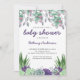 Succulents invitation baby shower dans les tons de violet et de vert neutres de genre. Cette aquarelle de plantes de jardin désertique présente des succulents, de l'aloe vera et de la verdure botanique. Le libellé est écrit dans une combinaison moderne de typographie de script et d'une police majuscule classique. Des invitations attrayantes pour une petite fille ou un petit garçon avec des étiquettes de faveur "Watch me faire pousser" et des fournitures de fête disponibles dans notre magasin.