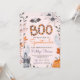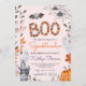 Adorable invitation festive à l'halloween avec fantômes, citrouilles, chauves-souris, araignées et feuilles d'automne.